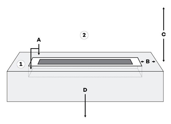 D - Die optimale Tiefe hängt vom Brenner ab. Wenn Sie jedoch einen Fernseher über dem Biokamin haben möchten, sollten Sie etwas mehr Platz haben, um den Brenner weiter hineinzuschieben. Mehr dazu unter E.